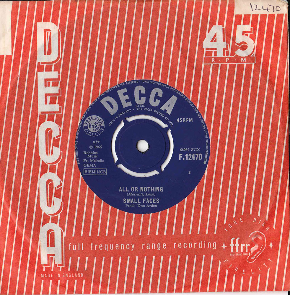 pop show performing four But when the song was previewed on David Jacobs' show Juke Box Jury it was given the thumbs down. Steve commented: "We ordered champagne when All or Nothing was voted a miss. That wasn't sour grapes on our part. It's just that we learned through experience not to put any faith in Juke Box Jury verdicts! They voted What'Cha Gonna Do About It a miss and it was a hit and I've Got Mine a hit and it was a miss" So there you go!" A little known fact about All or Nothing is that it actually slipped through the censor's net. The song was rather risqu for its day as it was about a bloke trying to make a girl! All or Nothing went on the knock the Beatles' Yellow Submarine off the top of the UK charts to give the Small Faces their first number one and confirm their position as the country's hottest new act. In the July/August edition of The Small Faces Fan Club newsletter, the secretary, Pauline Corcoran, reported that the band's new album and follow-up to the hugely successful Small Faces would be released in November 1966. The newsletter also reported that one of the songs on the forthcoming LP would feature an operatic intro by the band's notorious manager, Don Arden. The track in question turned out to be a cover of the Del Shannon hit Runaway, which didn't actually see the light of day until about a year later on Decca's compilation of hits and left-overs, From the Beginning. Steve Marriott hinted at the band's new move away from rhythm & blues during an interview with Brian Matthew on the BBC radio show Saturday Club. He stated that the band was experimenting with electronic sounds. In another interview Ronnie Lane said that among the numbers the band had recorded for the new album were That Man, In My Mind's Eye and a track called (Tell Me) Have You Ever Seen Me? This track apparently came about when Ronnie played a track from their first album backwards, liked what he heard, and came up with the tune! The nature of the tracks in question suggested that the Small Faces were progressing fro the R 'n' B roots towards tentative psychedelia. As Ronnie put it, "Towards the end of 1966, we were becoming more thoughtful and psychedelic! Phew! I got spiked at a party thrown by the Beatles' manager Brian Epstein. Anyway, this guy came out with a plateful of oranges which were cut into quarters. He passed them around to all guests and I thought, this is a bit weird, funny party, ain't it? So I thought I'll have a bit of this orange and I took a piece and I took it at the same time as everybody else did, y'know. But about half an hour later, things started to happen, y'know. I didn't know if I'd been given anything or what was happening. I didn't know if I was coming or going! And it was quite horrific at the time but it then turned into something that was quite beautiful!" Ronnie was probably more influenced by the psychedelic experience than any of the other Small Faces, "Ronnie was looking for the meaning of life." Steve explained. "He wanted more purpose out of life, I suppose which is hard for anybody who's searching for something, especially when your two best mates are a pair of piss-artists like me and Mac! Ronnie had this peach and a daffodil, which he worshipped, and a scroll which was meant to be his soul. When he was out one night, Mac squashed the daffodil and I ate the peach. Then we burned the scroll! Yes, when Ronnie got meaningful, he had to be brought back down to earth!" Previously published in Darlings of Wapping Wharf Launderette Links |